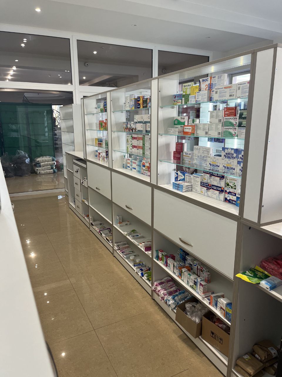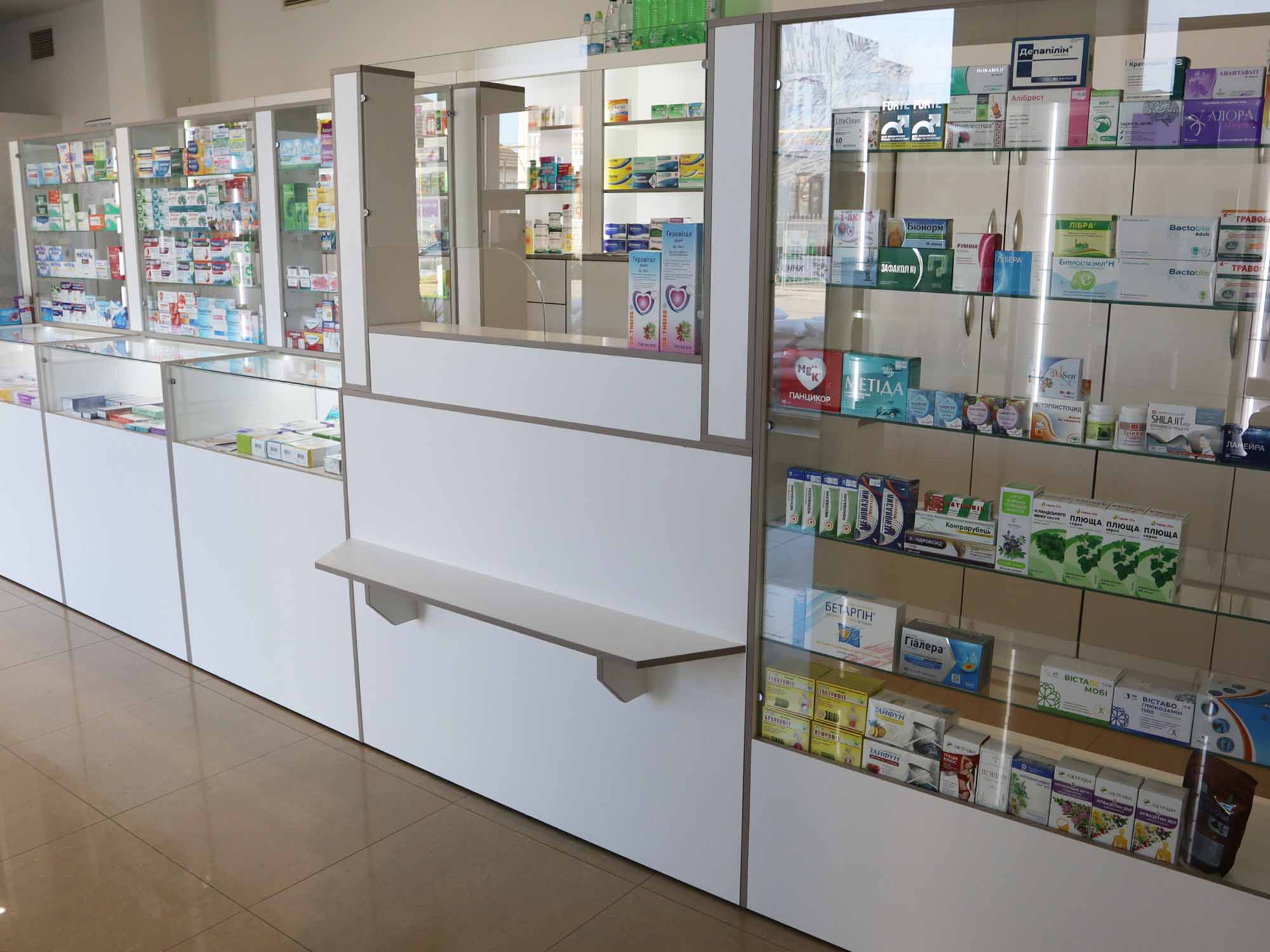 Для виготовлення меблів було обрано ДСП білого кольору — практичне та універсальне рішення для аптечного простору. Пластикова кромка відтінку «сіра глина» стала вдалим акцентом, який додав інтер’єру сучасності та акуратності.