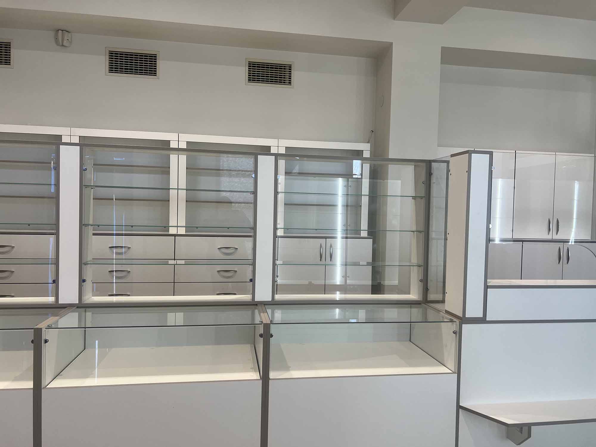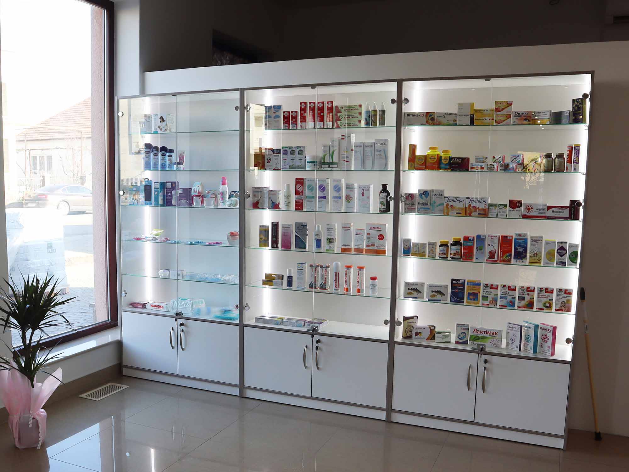 - шафи зі скляними дверцятами та підсвіткою для кращого огляду асортименту.