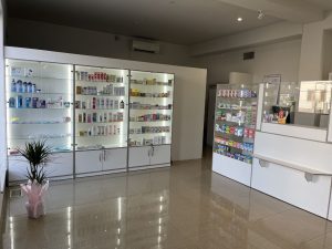 Для виготовлення меблів було обрано ДСП білого кольору — практичне та універсальне рішення для аптечного простору. Пластикова кромка відтінку «сіра глина» стала вдалим акцентом, який додав інтер’єру сучасності та акуратності.