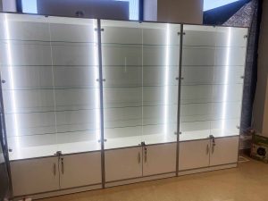 - шафи зі скляними дверцятами та підсвіткою для кращого огляду асортименту.