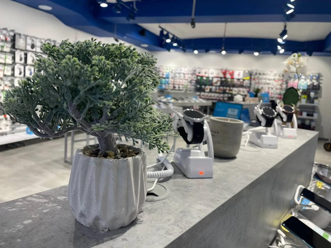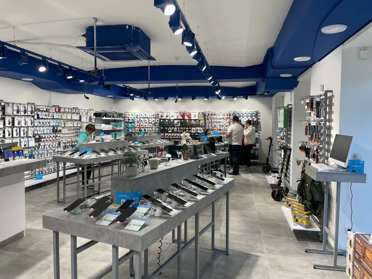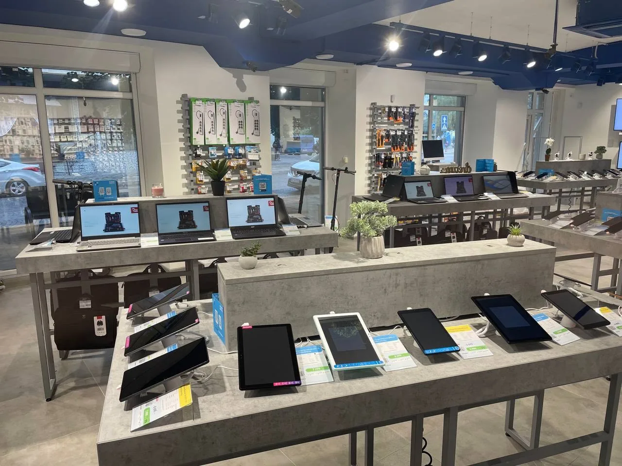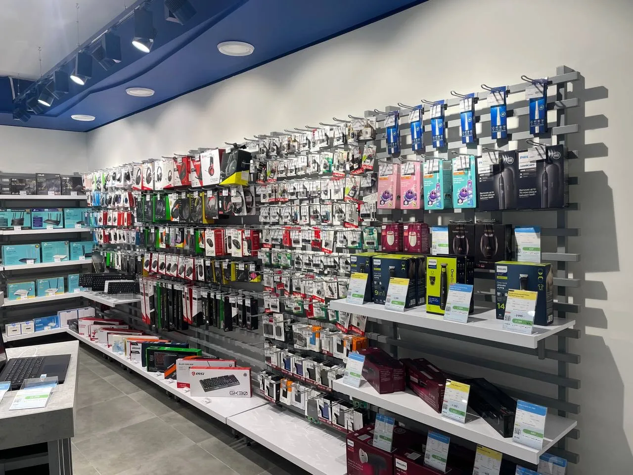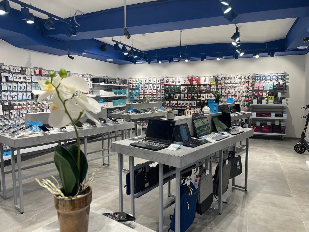 Рішення від компанії ROMKOS – пристінні стелажі з навісними полицями та аксесуарами, спеціалізовані столи для мобільної та комп’ютерної техніки з системою електроживлення. При розробці та виготовленні меблів враховується фірмовий стиль. Дизайн, габарити, матеріали, колір підбиралися відповідно до брендбуку замовника, товарів та приміщення.