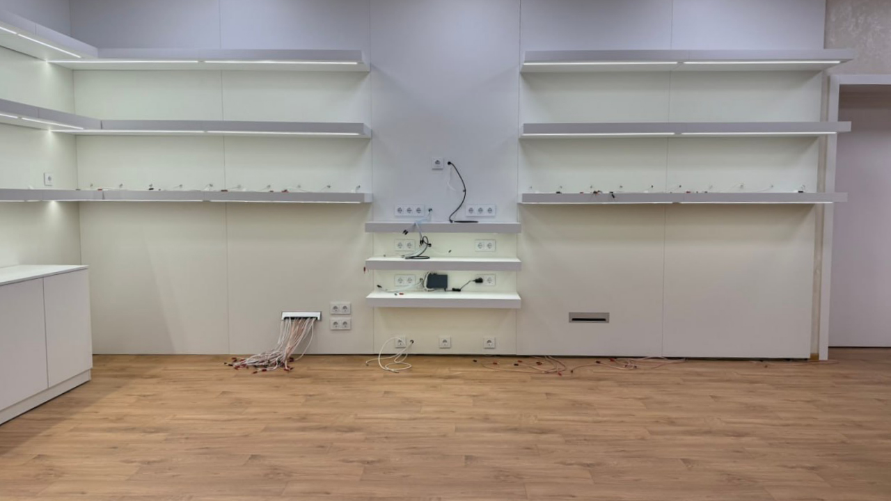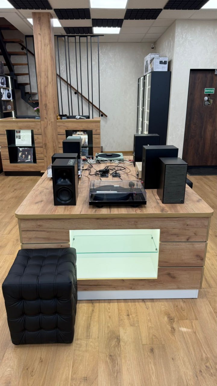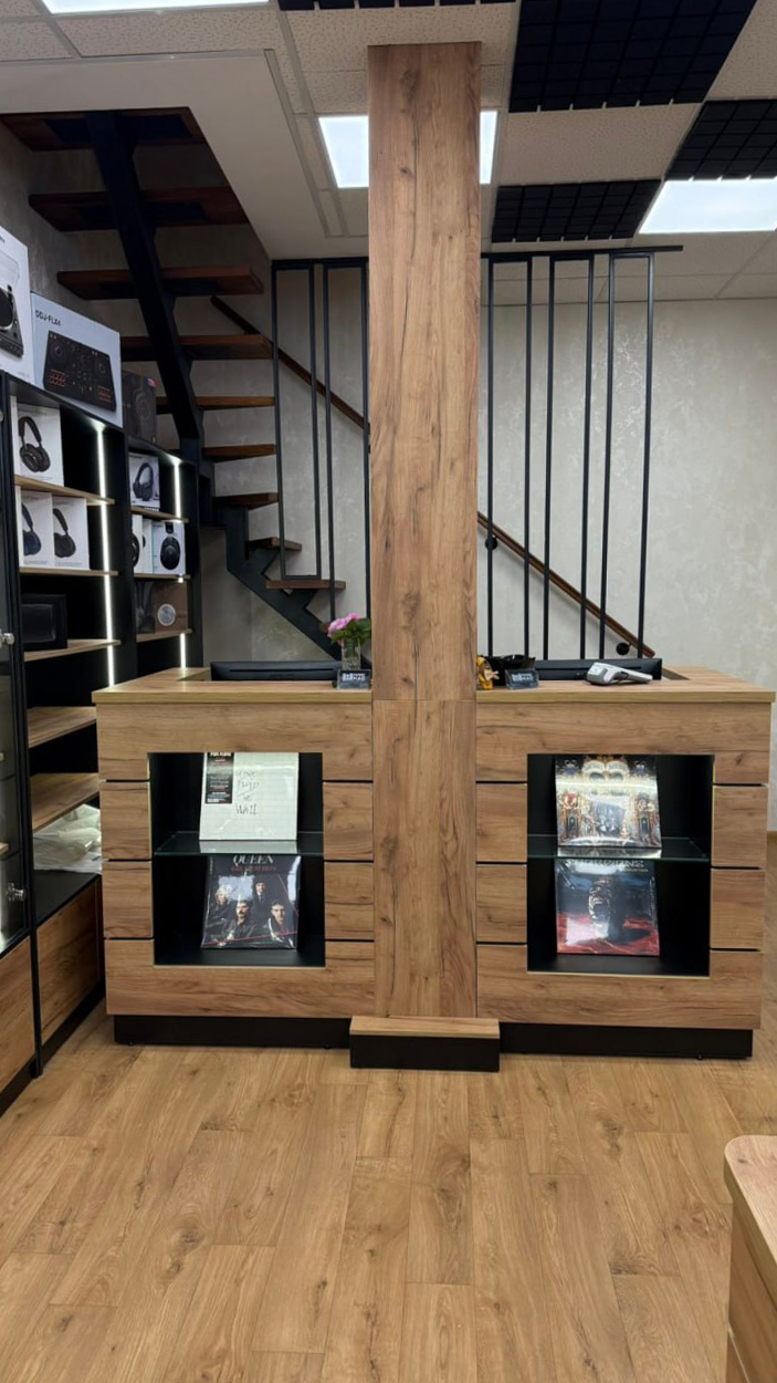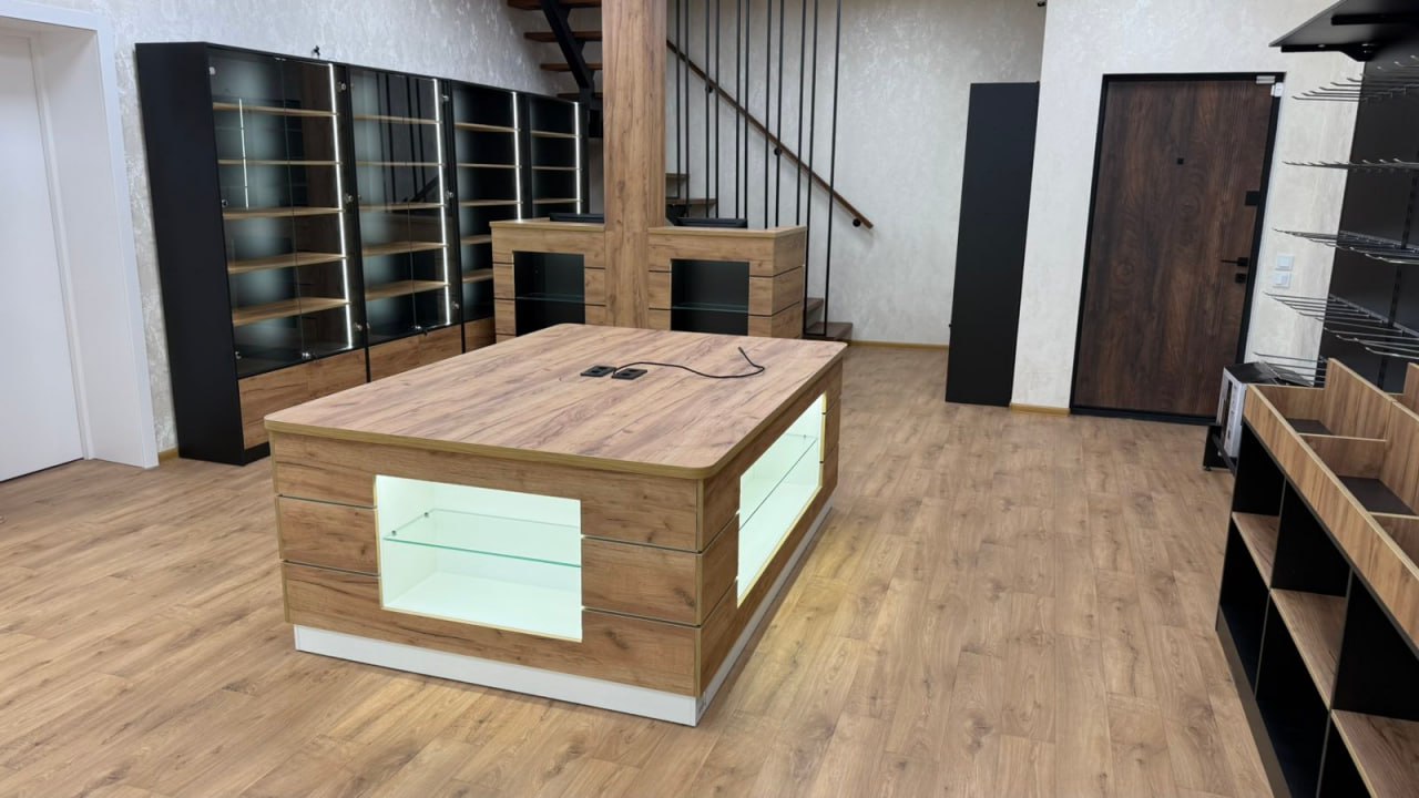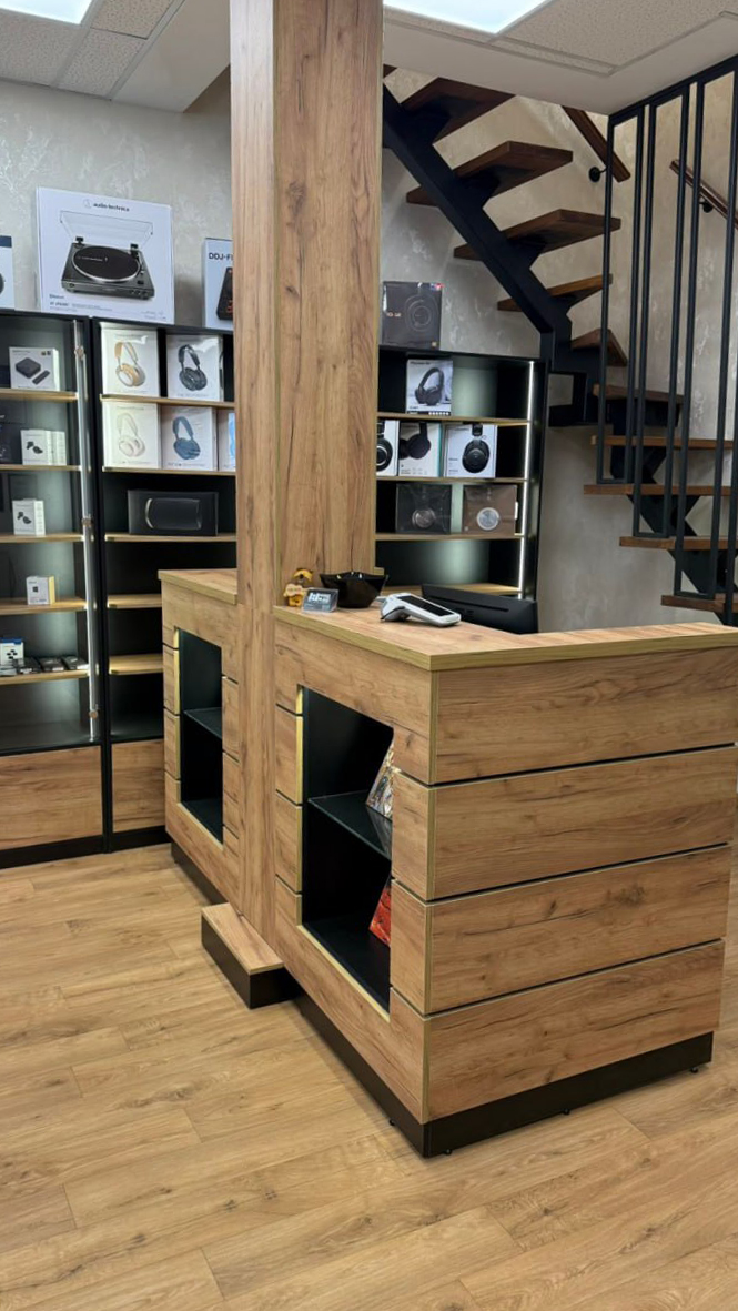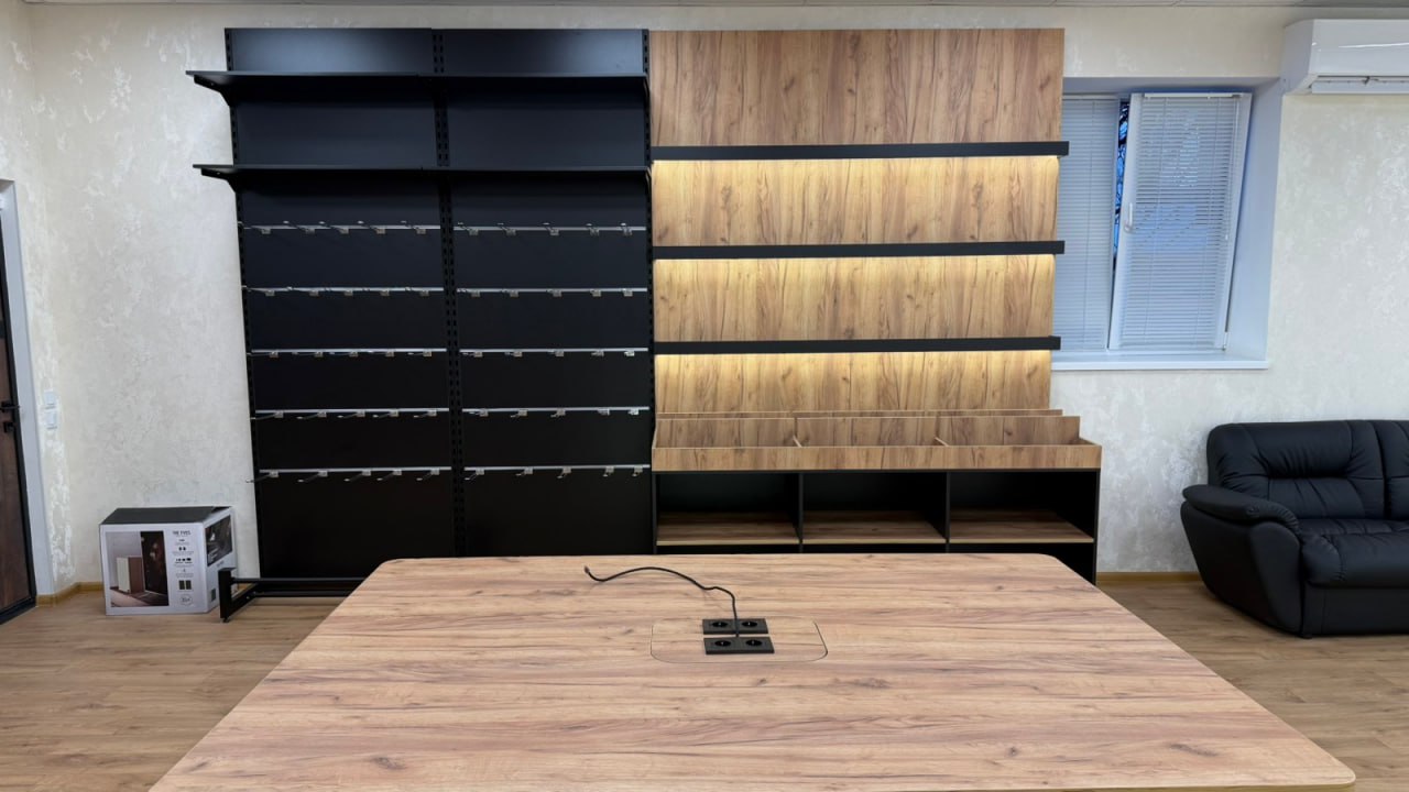 Были созданы несколько тематических зон с учетом специфики товаров, а также изготовлены специальные торговые столы и стеллажи для техники.