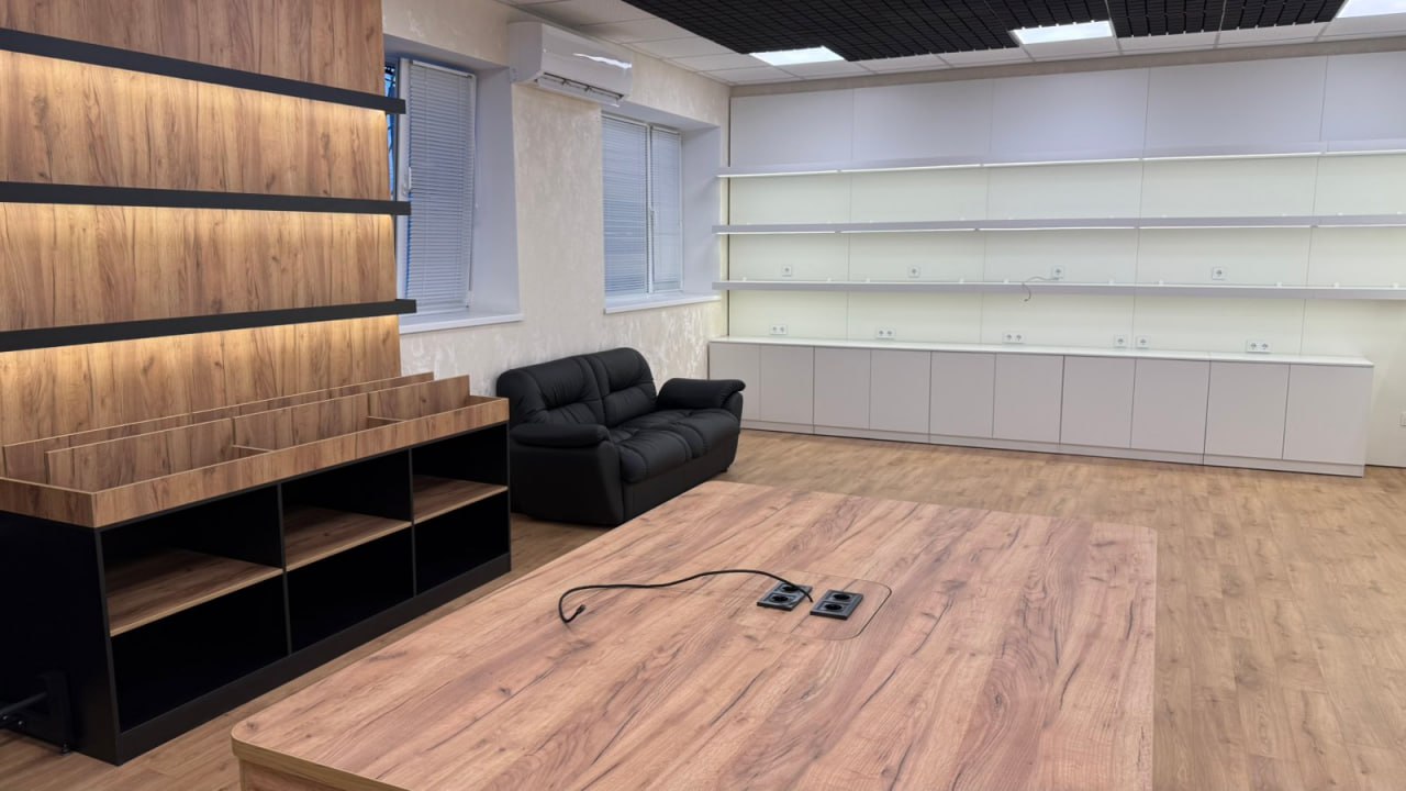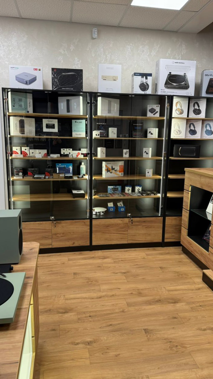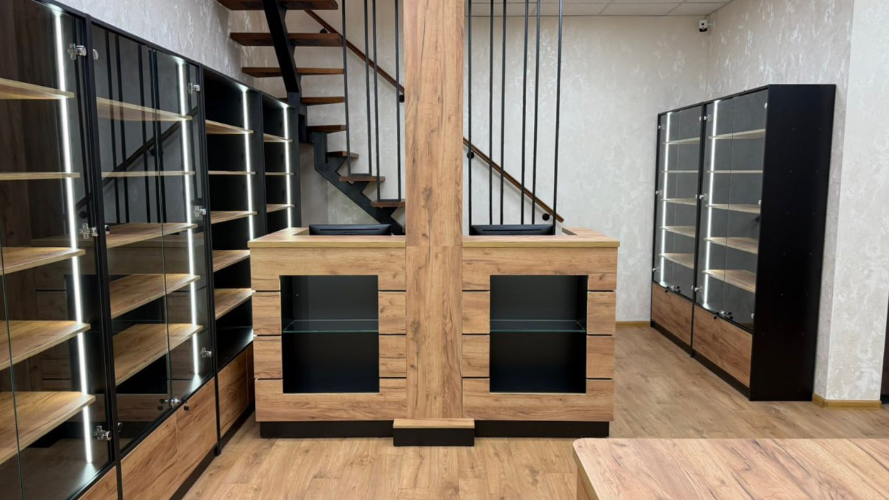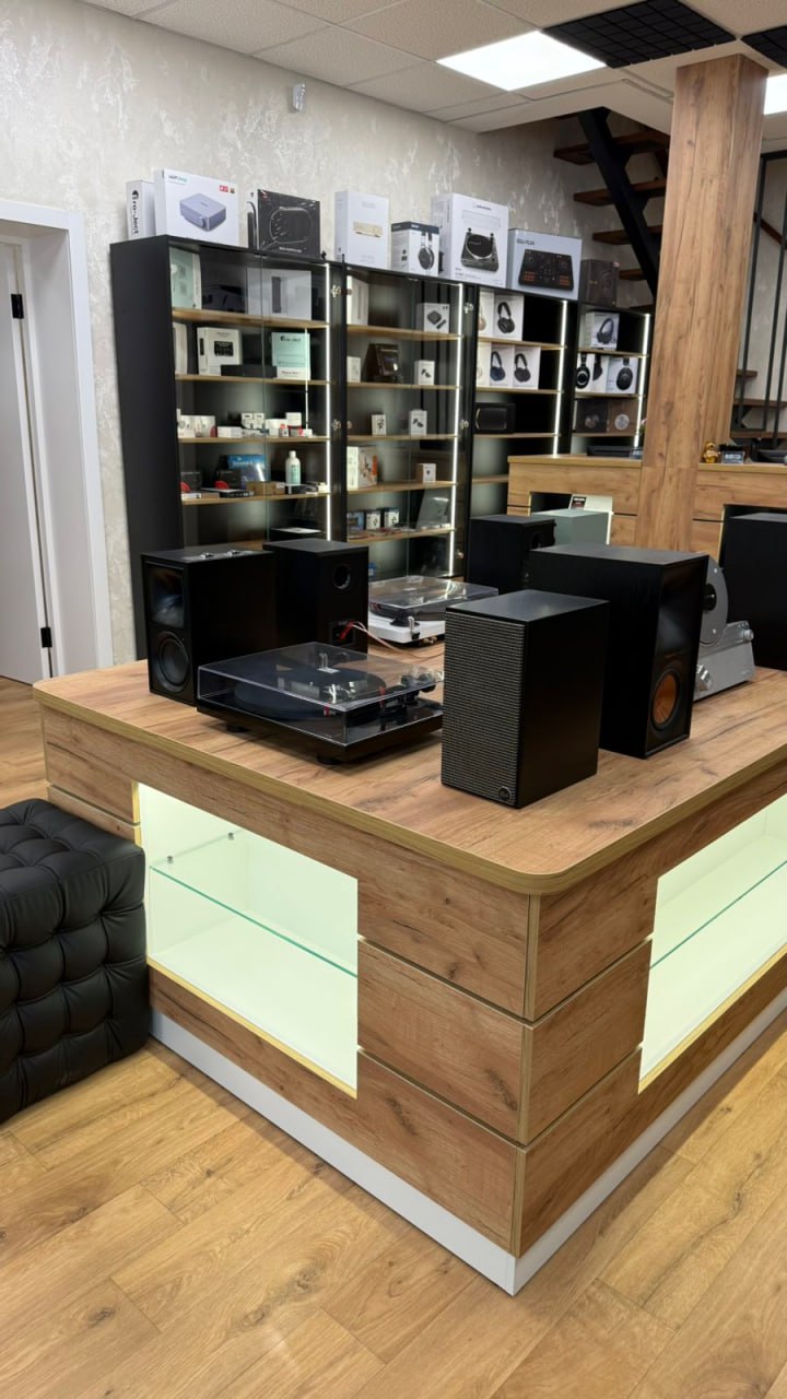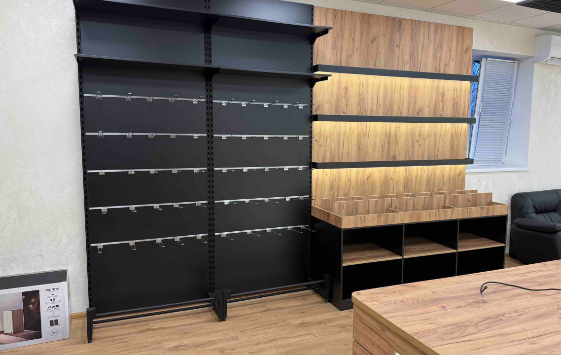 Были созданы несколько тематических зон с учетом специфики товаров, а также изготовлены специальные торговые столы и стеллажи для техники.