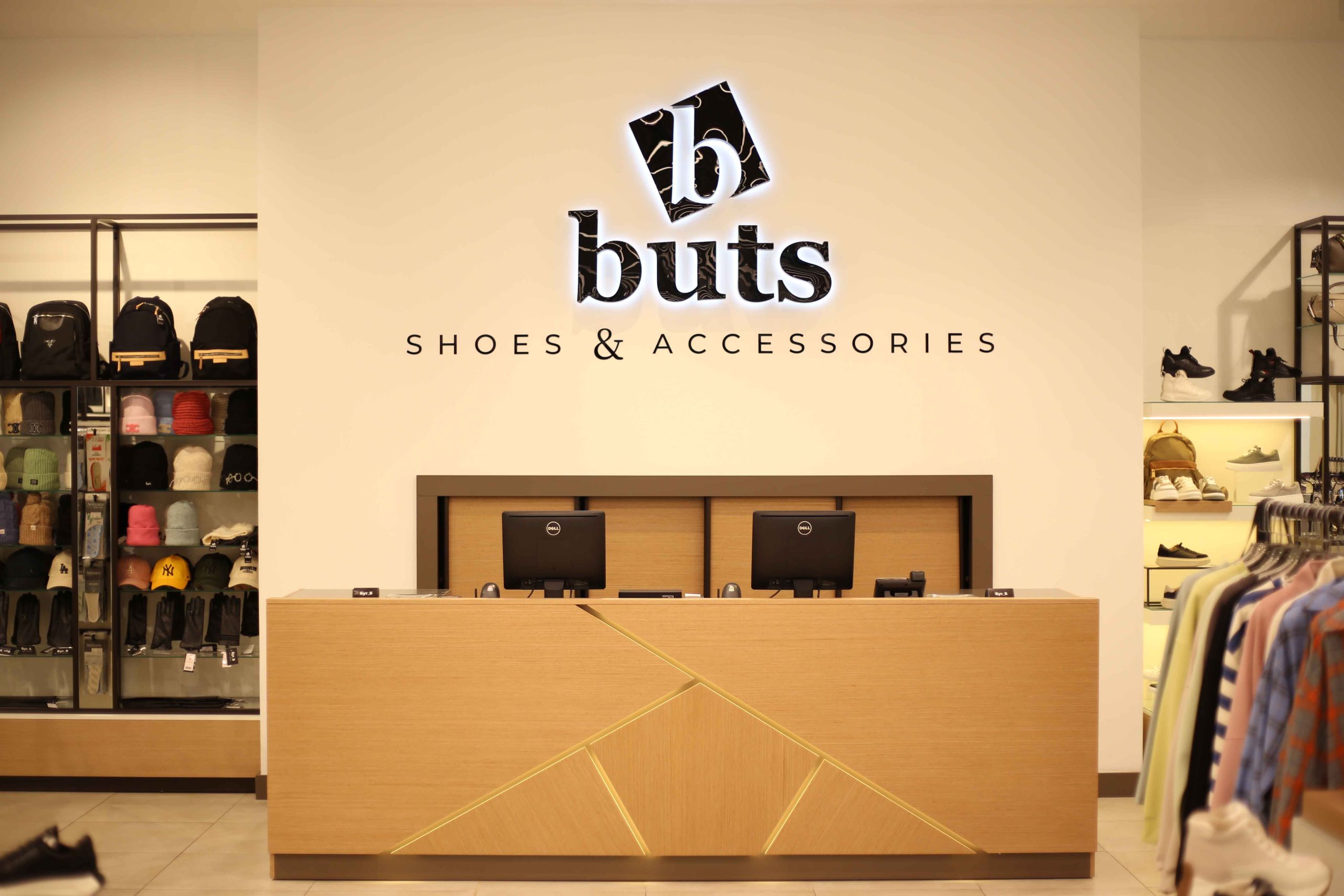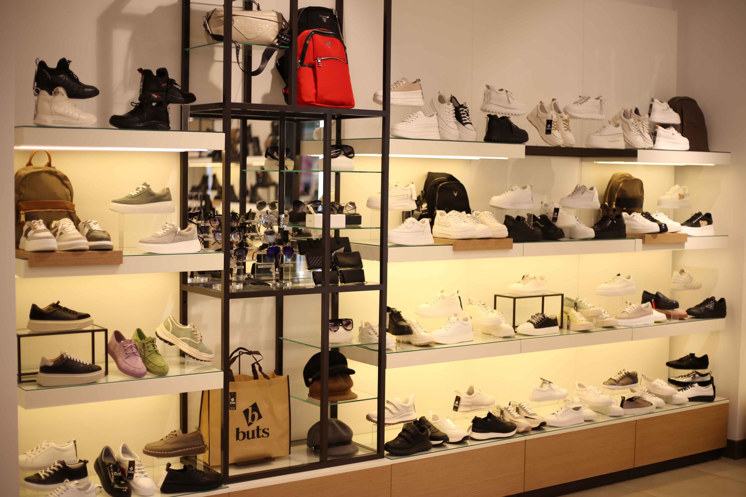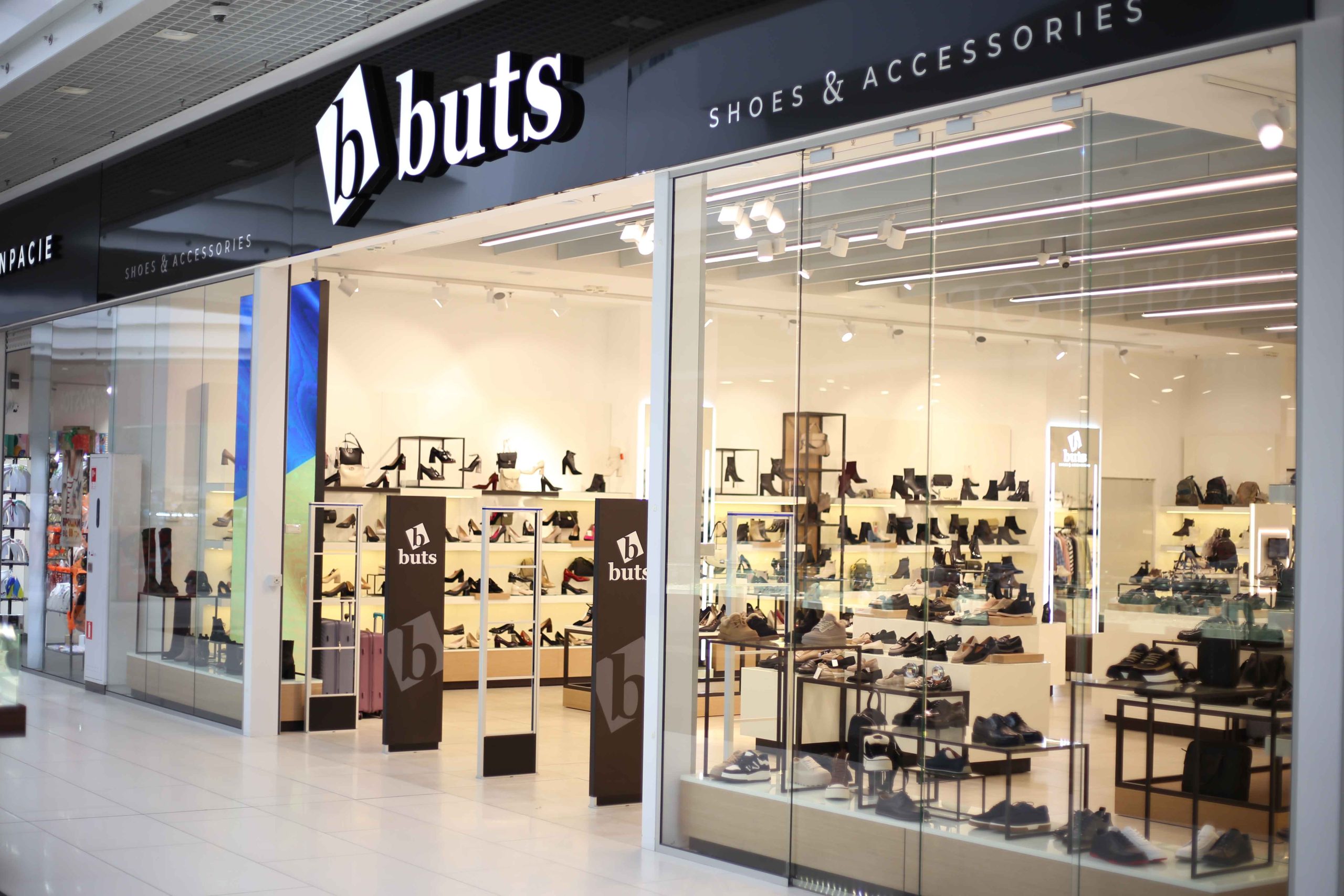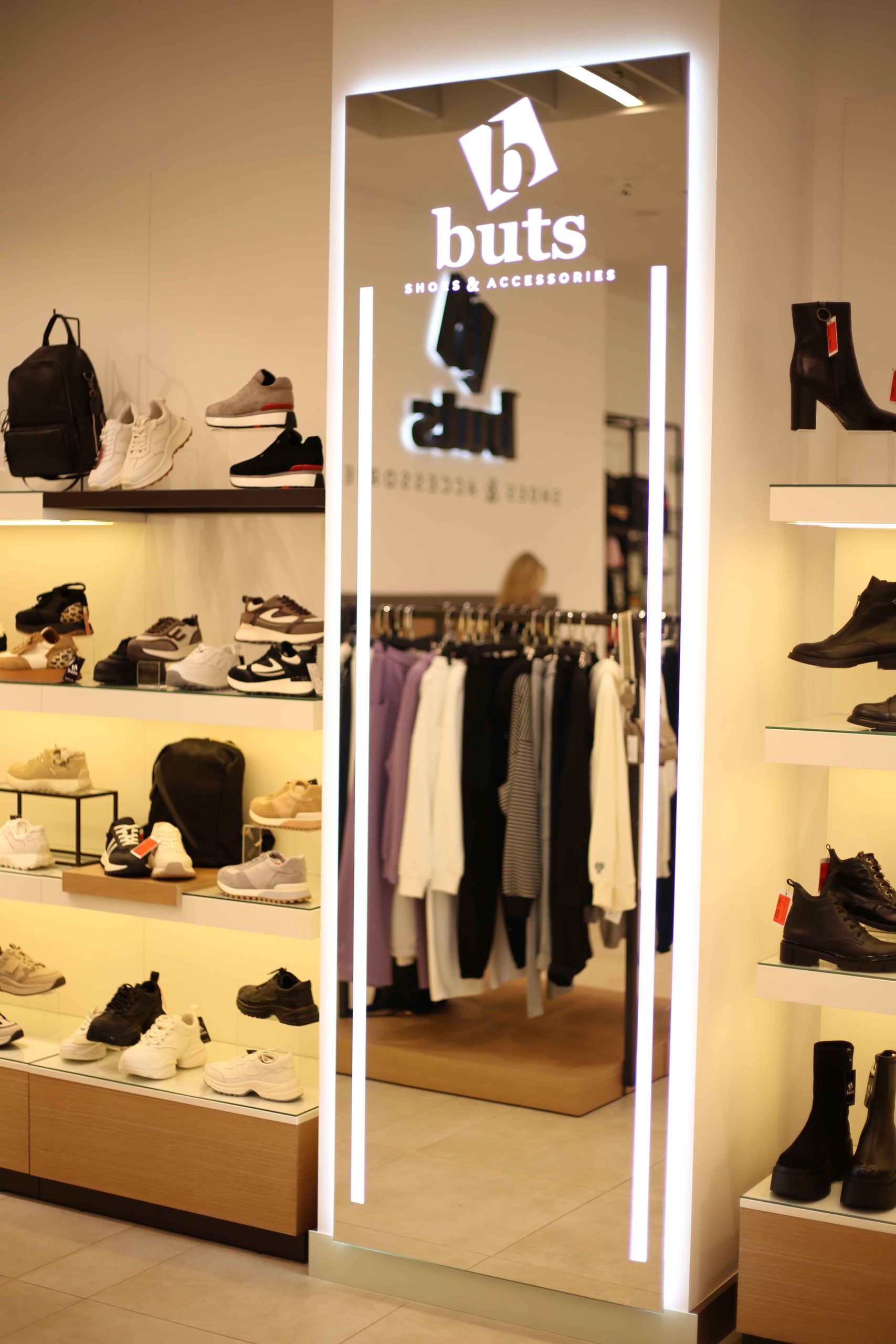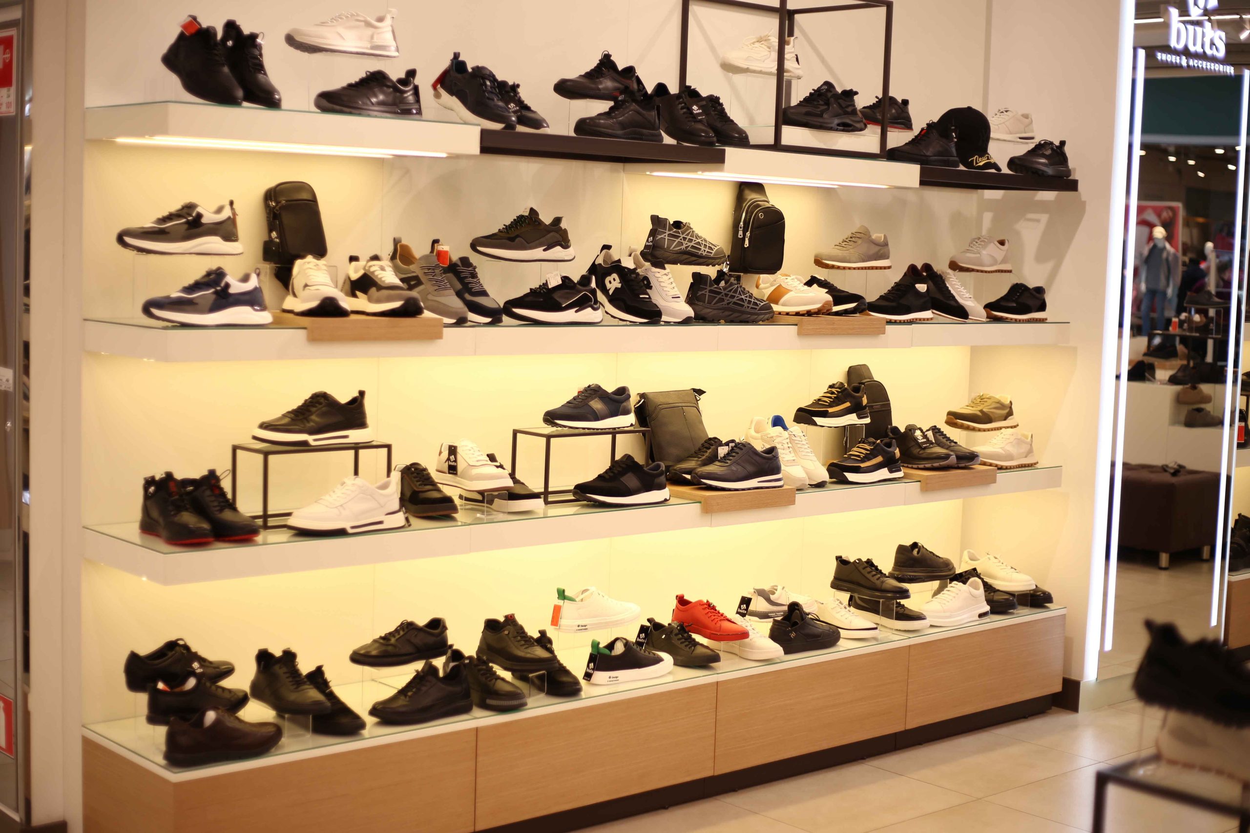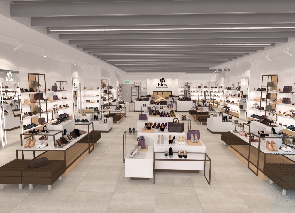 Сеть магазинов обуви Buts обратилась к нам с задачей создать дизайн и изготовить торговое оборудование для нового магазина в ТРЦ Hollywood, г. Чернигов.
