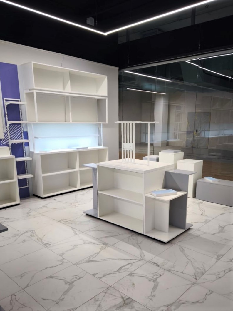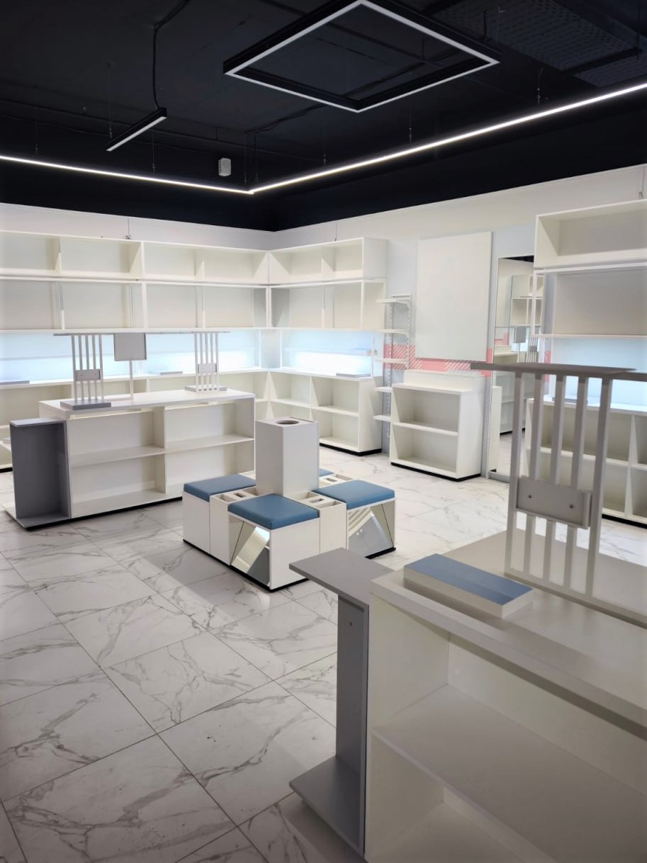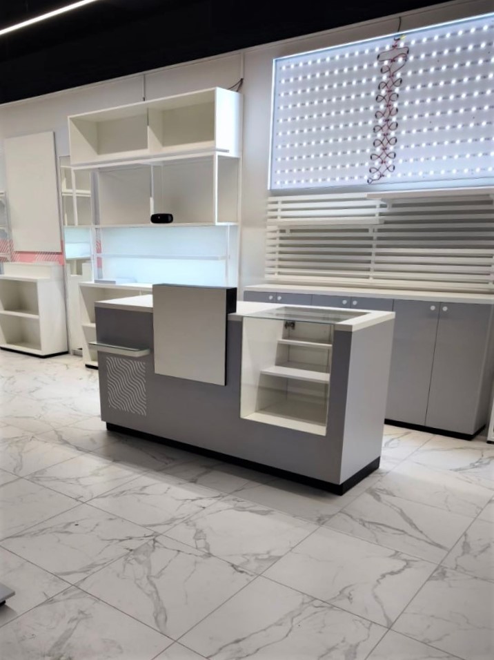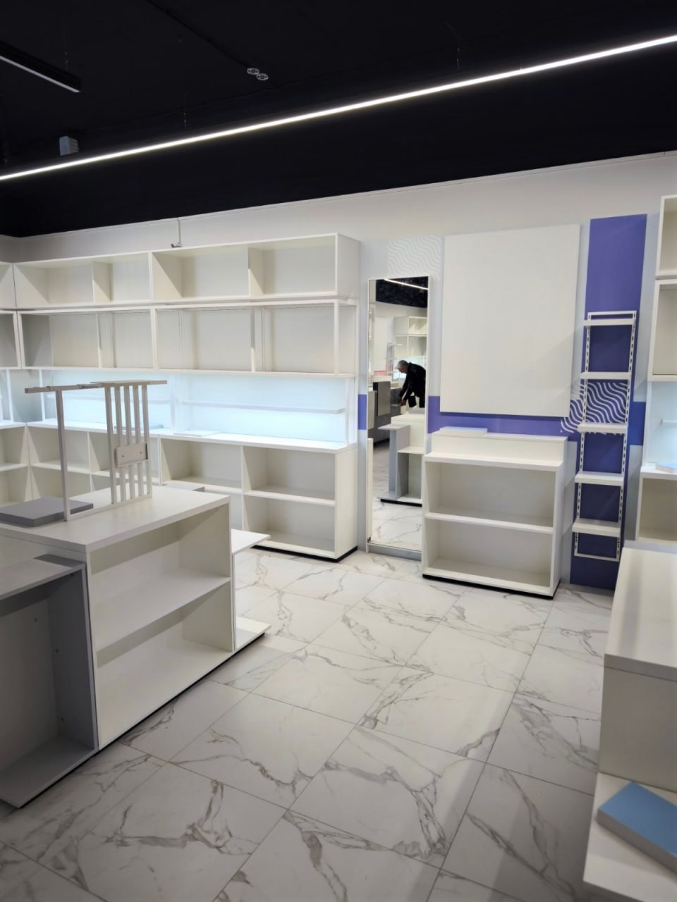 Работы выполнялись комплексно — от витрин и стеллажей до обустройства примерочных зон и кассовой стойки. Мы учли все пожелания заказчика и работали в соответствии с проектом.