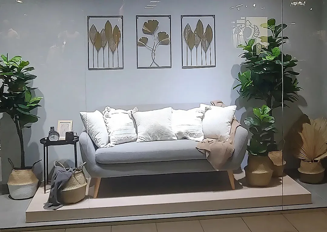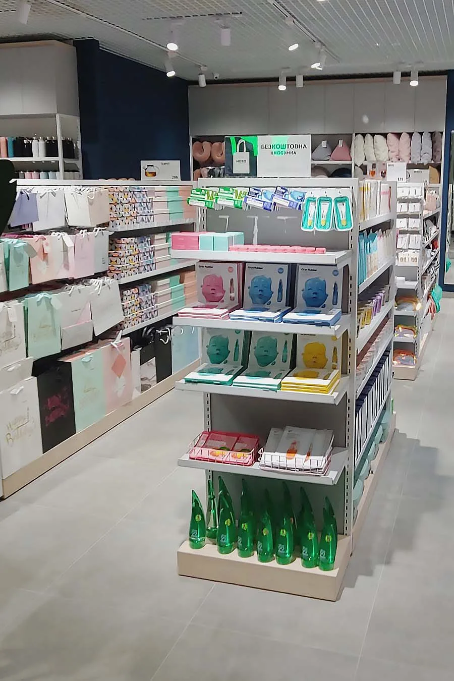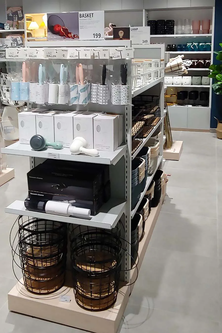 Сам интерьер магазина также выдержан в скандинавском стиле. Светлые цвета, четкие линии, простые и функциональные конструкции. В магазинах товаров для дома всегда большой ассортимент. Поэтому применяются высокие стеллажи с большим количеством полок. Конструкций мобильные, т.е. вы можете переставлять полки, держатели и крючки, в зависимости от габаритов товара.