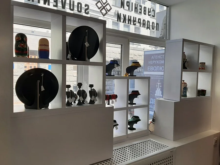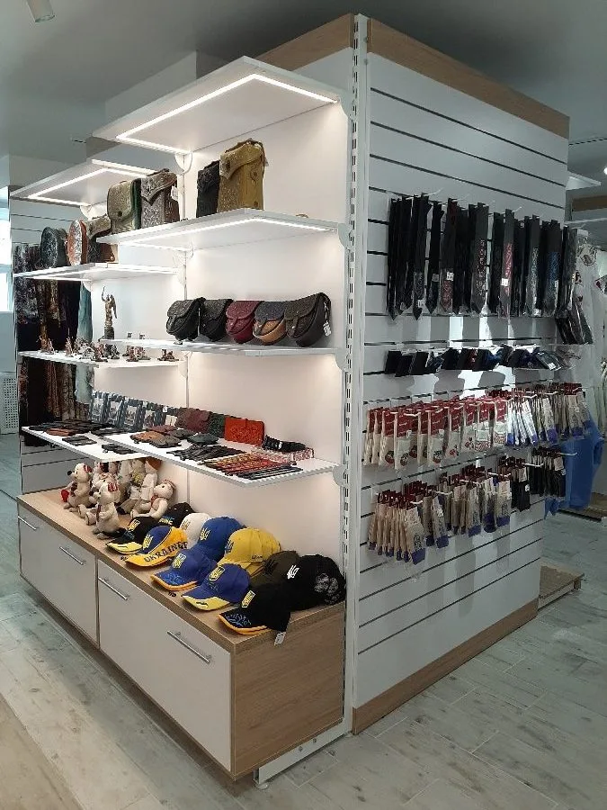 На полках торговых стеллажей для сувениров вмонтирована подсветка, она размещена снизу по периметру. Свет равномерно падает на нижние полки. Так все, даже мелкие вещи очень хорошо просматриваются. Для одежды установлено напольное оборудование и вешала.