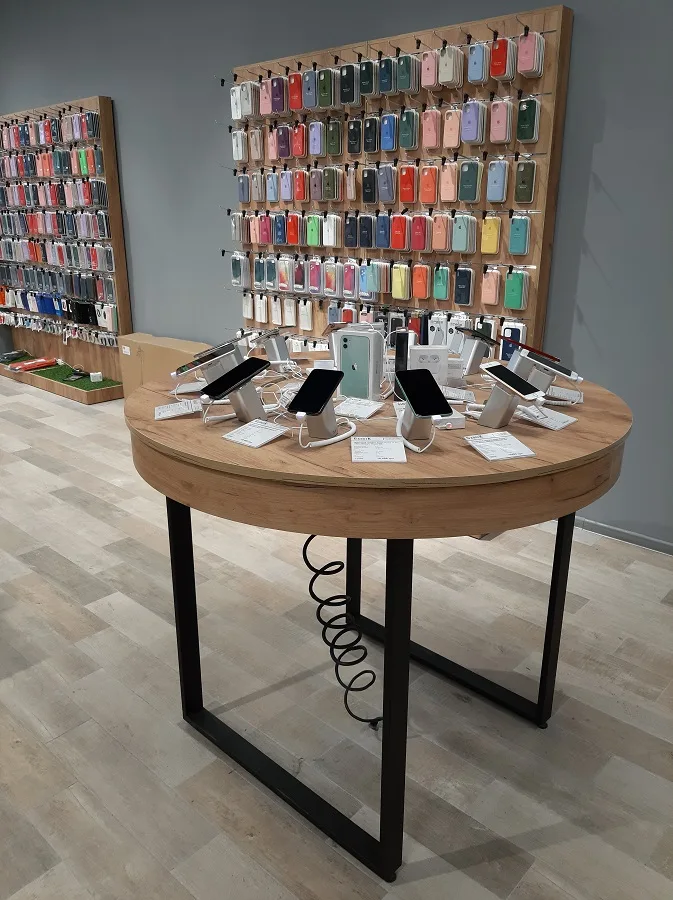 У стільницях спеціалізованих столів передбачені отвори для дротів зарядки. Комп’ютерна техніка, телефони, планшети одразу готові для демонстрації. Наші конструктори розробили кілька моделей таких столів: на декілька рівнів, прямокутні та круглі, різних габаритів та з різних матеріалів. Ви можете обрати з наших варіантів, або фахівці розроблять модель спеціально для вашого торгового приміщення.